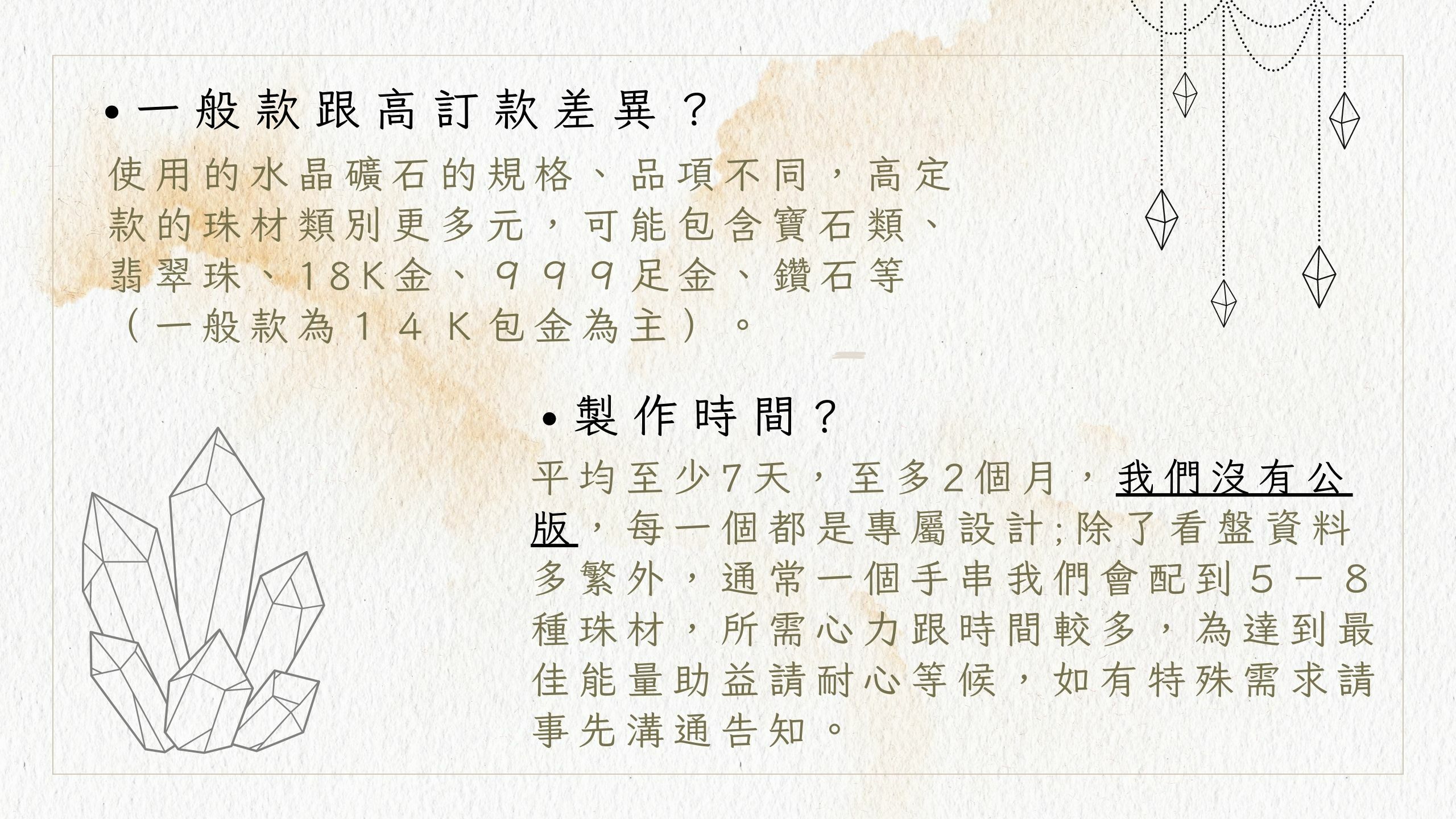 因五行設計有其意義跟配置,會考量每個人的能量補助跟設計美感配色請,請以專業建議為佳