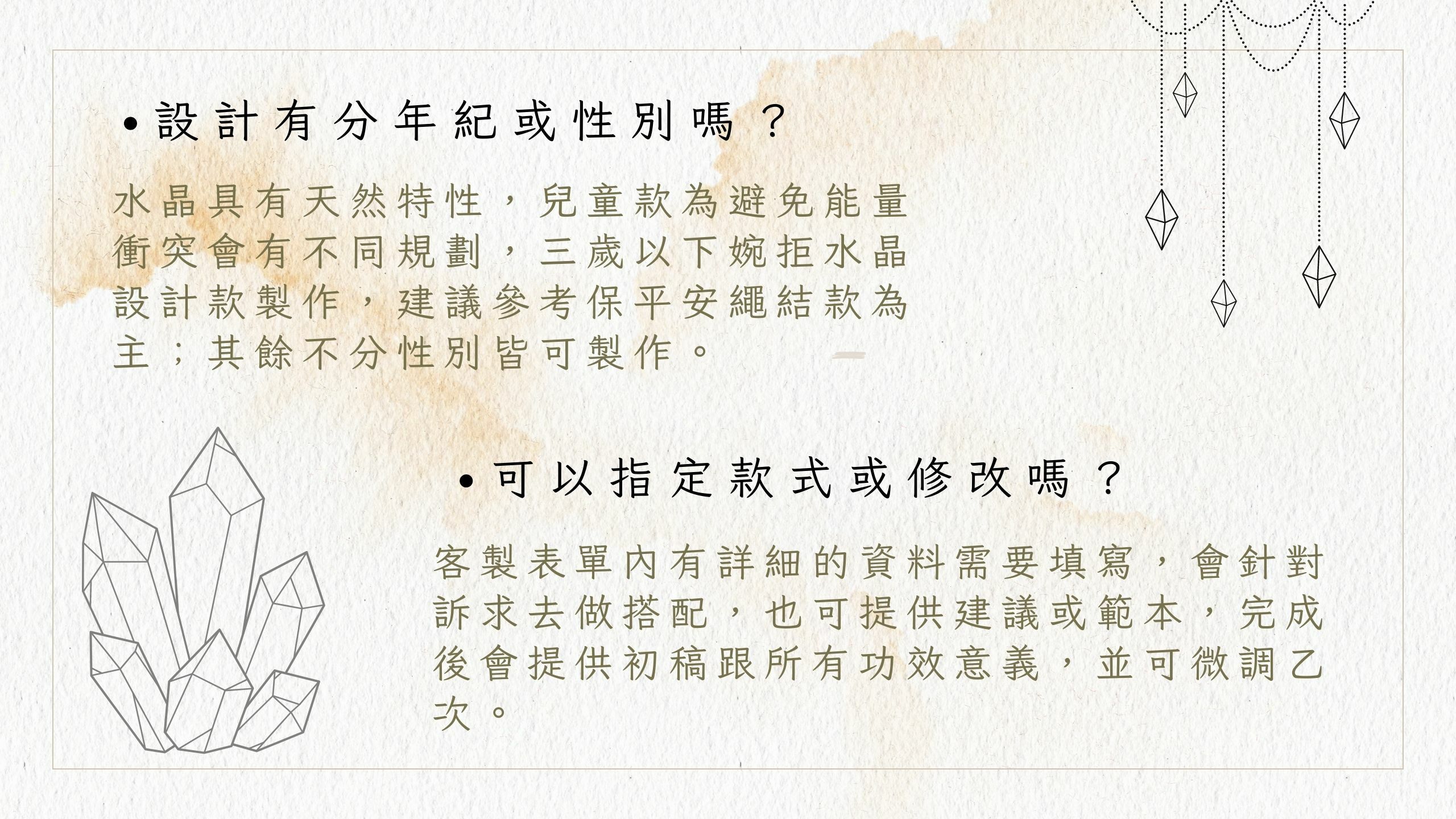 例如:情緒安穩、桃花人緣、財富創造、勇氣堅定、安定安眠、提升專注力、積極動力、避邪防惡、...