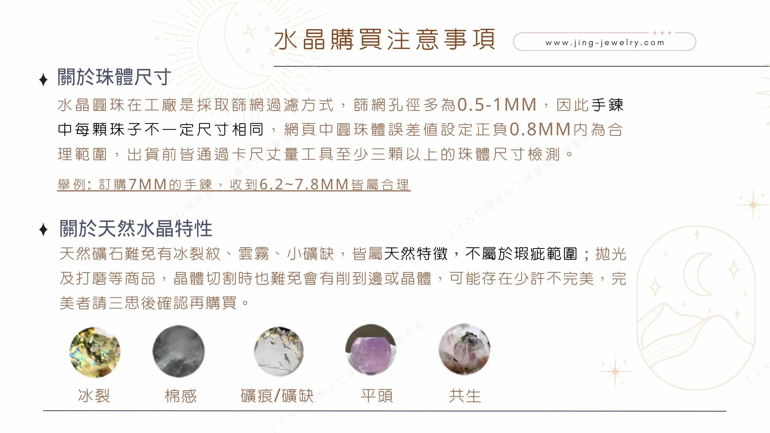 ● 天然石會有瑕疵屬於正常的,無可避免。所有天然晶石均有可能存在裂紋、棉絮、礦坑、平頭珠、黑點、雜質等小瑕疵,無法達到每顆珠子百分百完美,請欣賞和接納天然的不完美即是代表原始的自然。