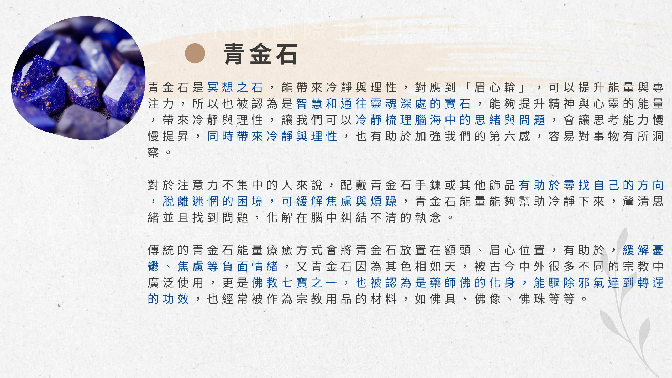 青金石除了幫助梳理思緒擺脫負面,更是佛教七寶也是藥師佛的化身