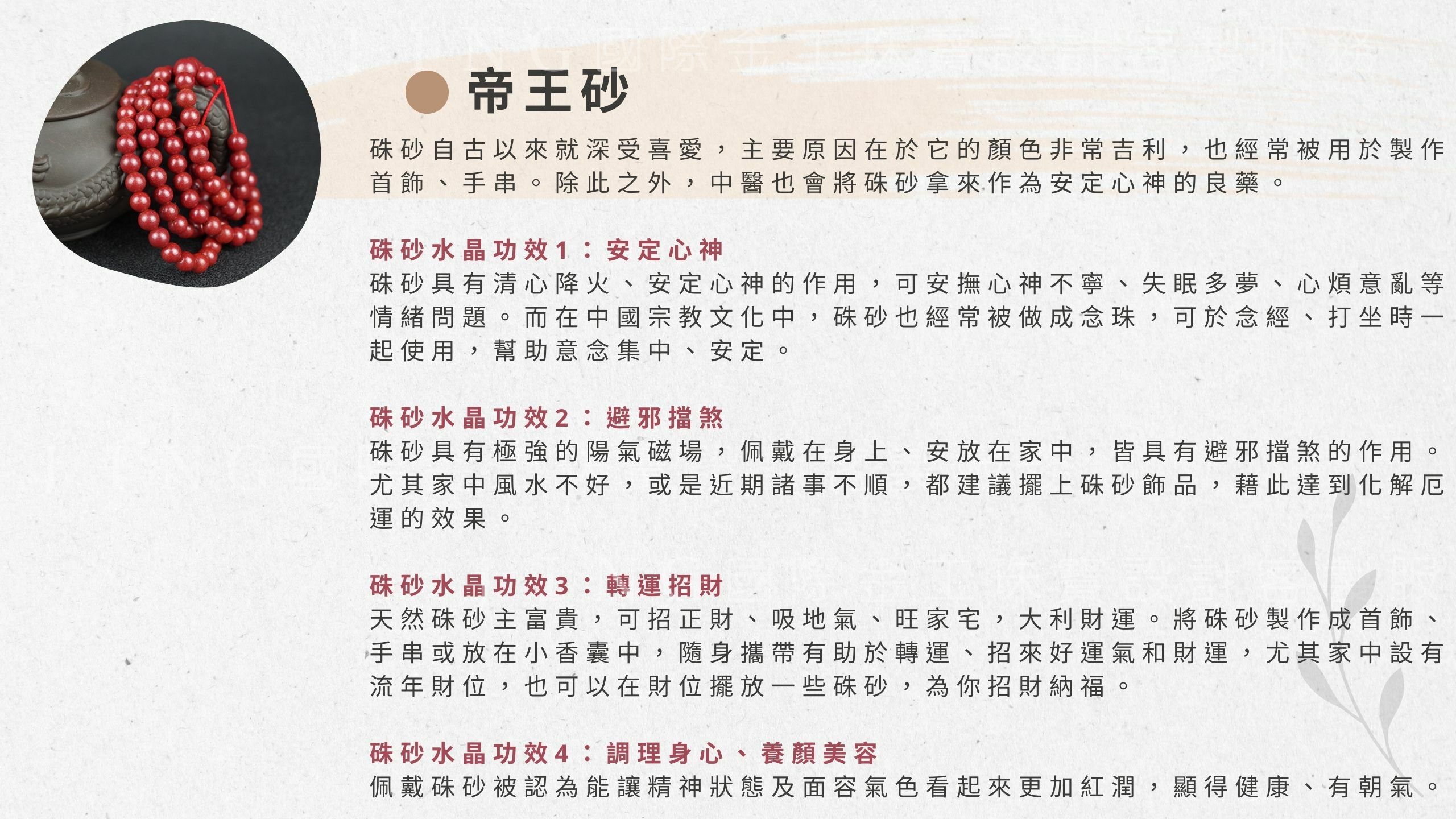 珠砂的安神避邪功效眾所皆知,對於個人磁場有提升陽氣的作用