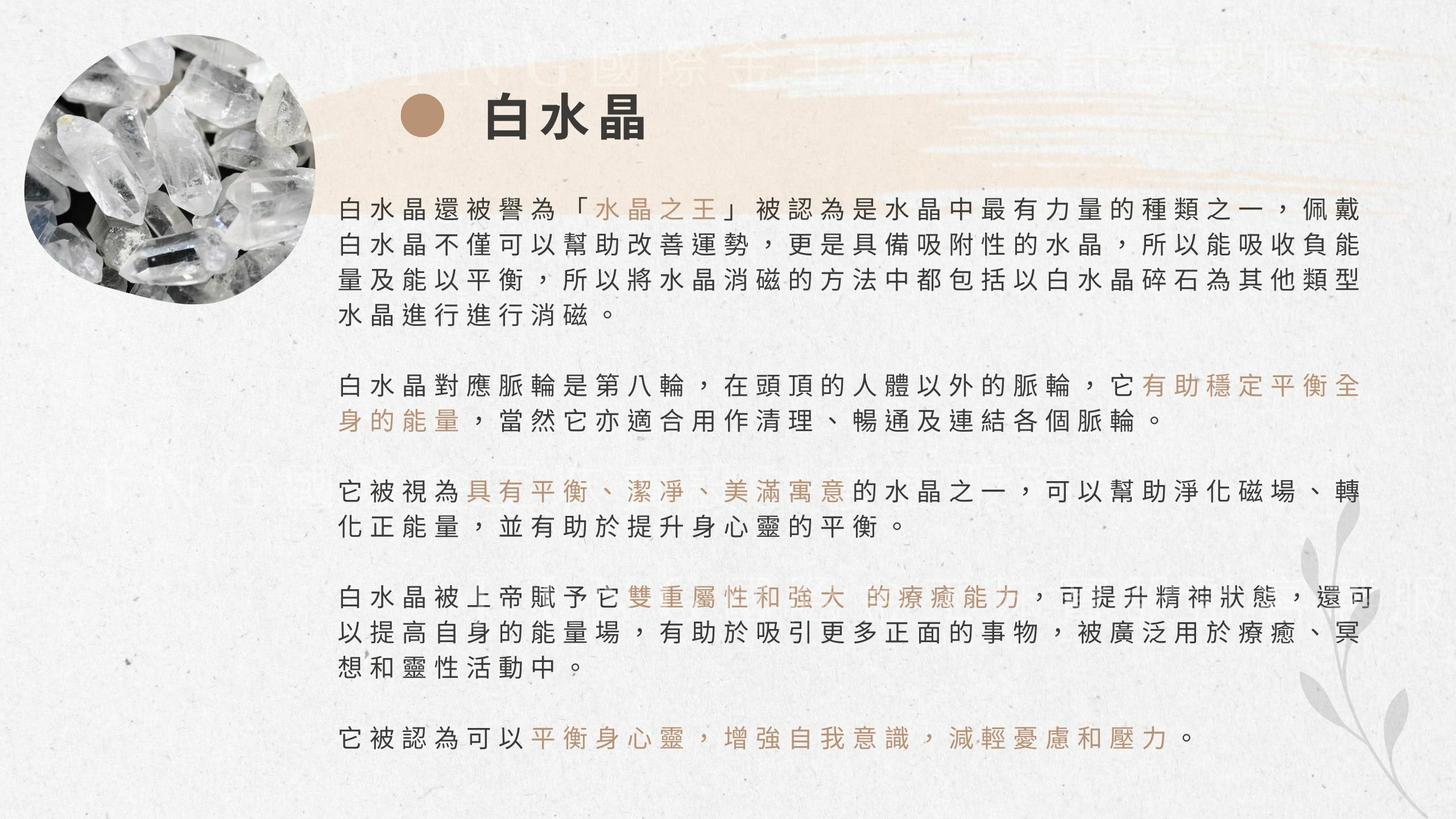 每一顆天然水晶都是獨一無二的,這就是天然水晶的魅力,欣賞當中的與別不同,感受天然能量的共振,平衡身體的脈輪能量,讓您的身體跟自身帶來良好的信念跟維持健康、感受愛和產生對生活的熱情。品牌主理人Jing為珠寶金工設計師並擁有鑑定師證照,原物料皆親自挑選,希望能以天然好能量帶來細膩温暖,將這份自然正能量傳遞。